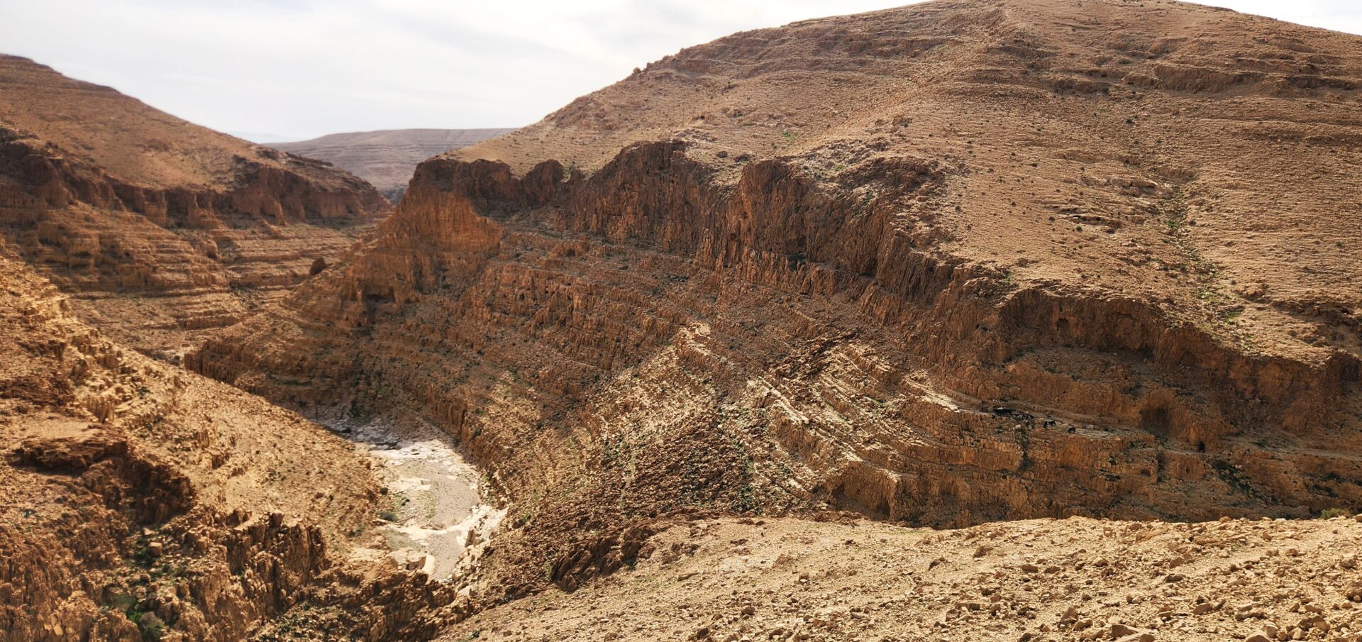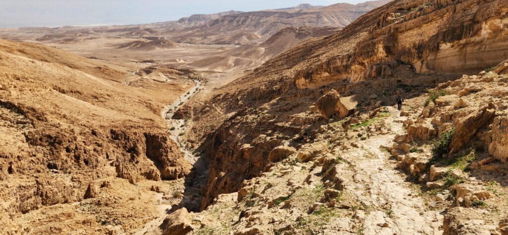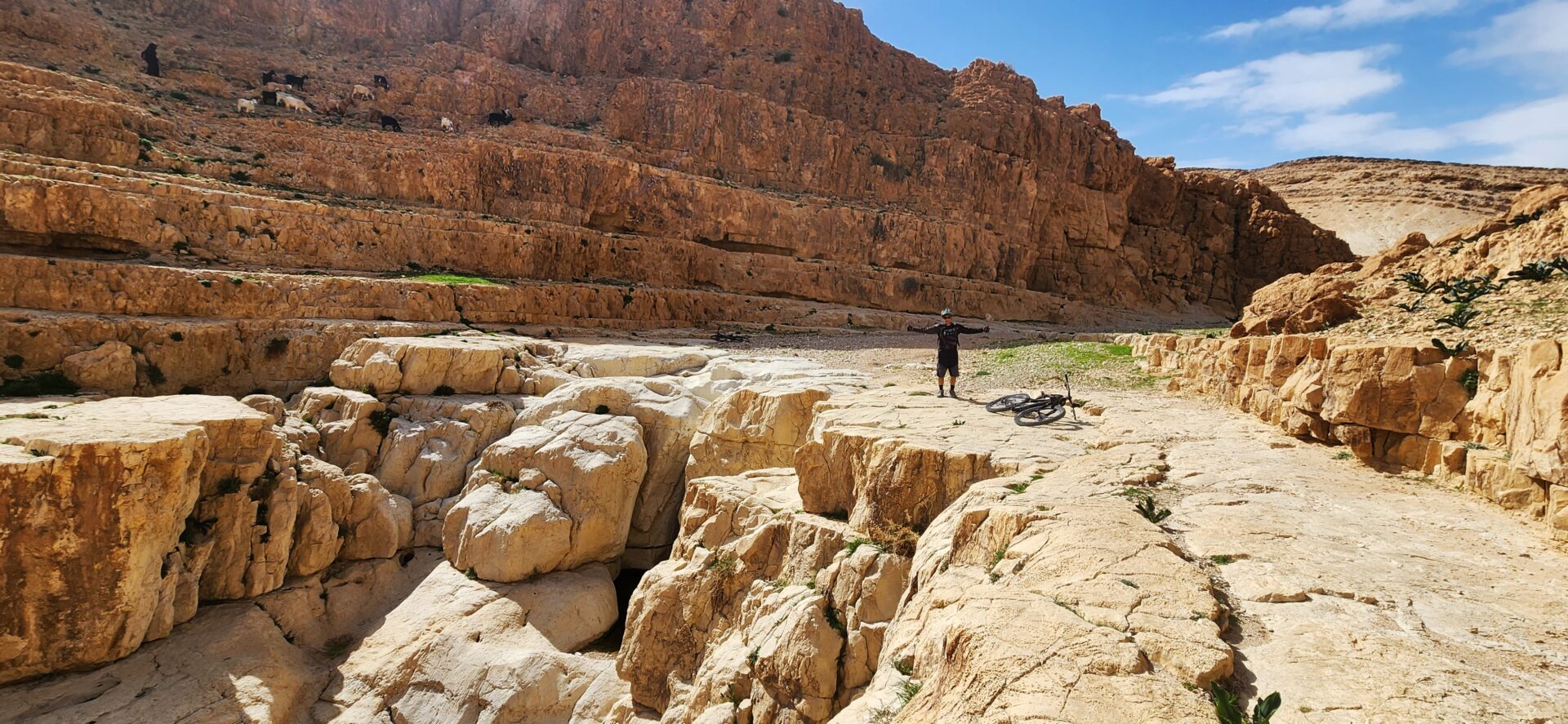 - בין ק"מ 32.1 ל- 32.8 מעבר על מצוקי מדפי סלע יפיפיים של נחל מנחם (מדי פעם הורדת הרגל, או מעבר רגלי של כמה מטרים), המשכנו בנקבים לסינגל גמל אדום (ק"מ 33.8) והלאה עם גמל אדום המסומן אדום המשך לכיוון מצדה.